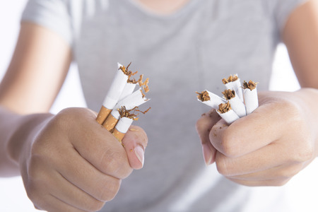 タバコを手に壊れた以上の喫煙は 健康上の理由のための灰色の T シャツ速報タバコで女の子のクローズ アップ の写真素材 画像素材 Image